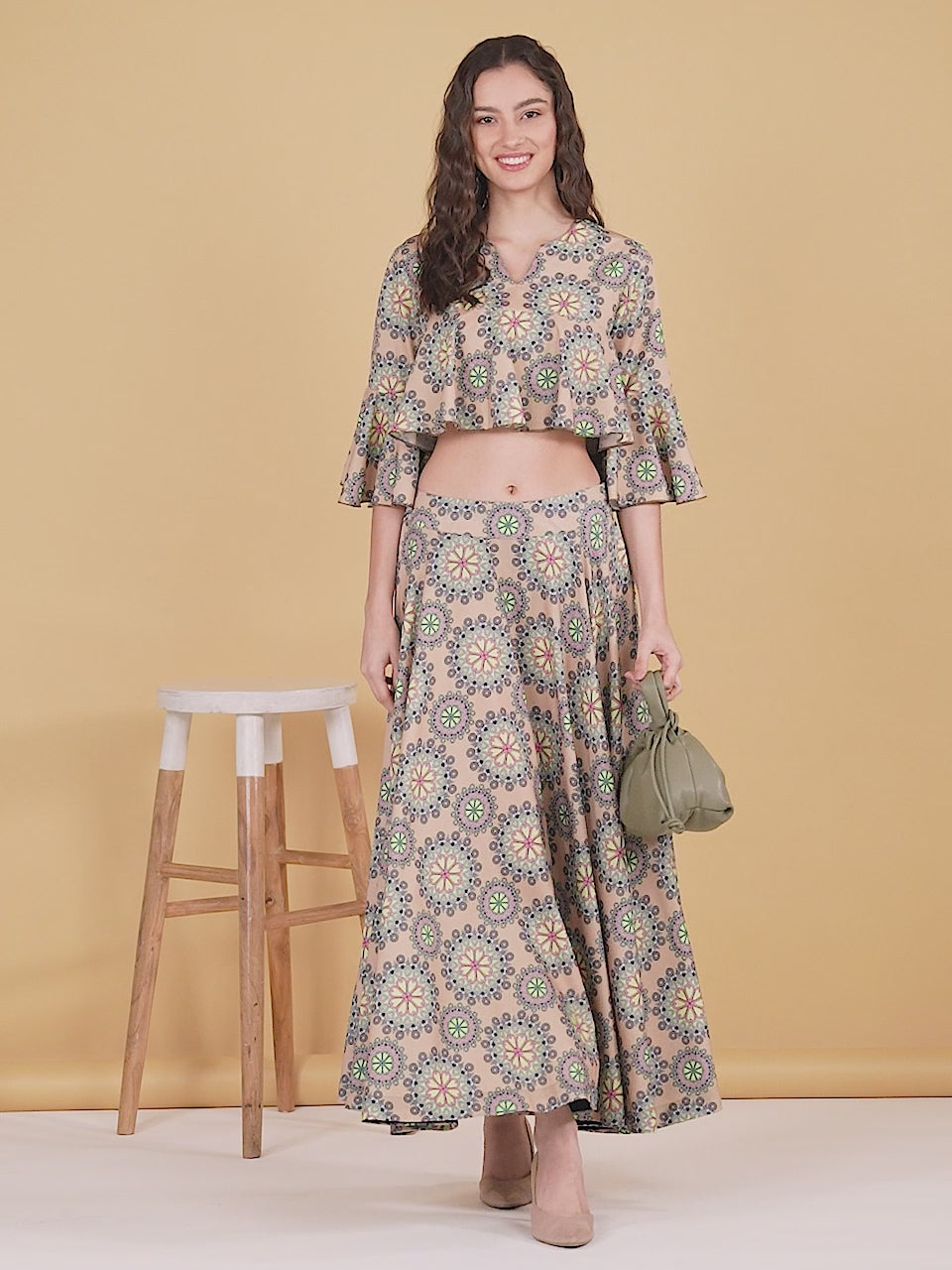 Floral Printed Beige Crop Top With SkirtFloral Printed Beige Crop Top With Skirt