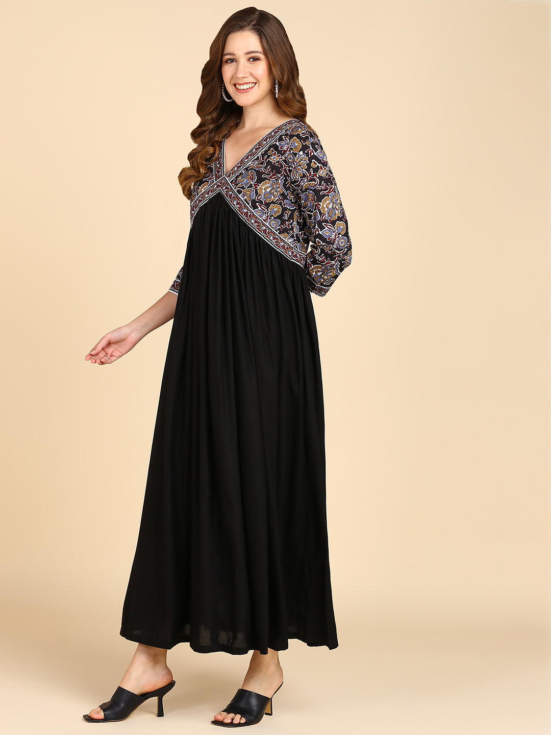 Black Floral Flared Maxi Dress With Border DetailsBlack Floral Flared Maxi Dress With Border Details- Regular price